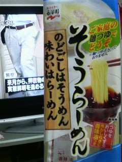 2009-08-26 そうめん+らーめん=そうらーめん。 ごにょごにょ・・・独り言。 今日、仕事帰りスーパーに寄り道。(^。^)シーチキンを買おうとウロウロしていたら「そう」という文字が!(つい、荘ちゃんの‘そう’と勘違いしちゃうのよね)のどごしは、そうめん。味わいは、らーめん。きっと、らーめん食べたいけどさっぱりと済ませたい時にゃ、こりゃ便利かもなぁ。(^_^)v