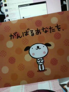 2011-01-28 がんばるあなたを. ごにょごにょ・・・独り言。 というメッセージカードが友人から届いたべさ。(^-^)先日、「何とか合格したべさ~」と試験の結果をメールで知らせたら、送ってくれたべさっ。(^∀^)y・・・応援メッセージもらえて、しばらく頑張れそう。(^_^;)