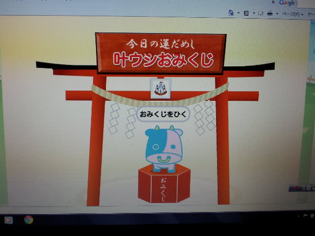 2013-06-09 叶ウシおみくじ。 ごにょごにょ・・・独り言。 今日は良い天気の北海道、ガッツリと真夏日なう。今日はこれから髪を切りに行くのに、ちょいと時間待ち。北海道ではちょうどタカトシさんの『ペケポン』が再放送中。ネットを覗いていくうちに、タカトシ牧場に到着なう。久々に「叶ウシおみくじ」を引いてみたべさ。(・∀・)今日の運はどんなんだべな?(^▽^)bとクリック。したっけ...........うほほーーーい!!!ライセンス藤原さんが登場!!!\(^∀^)/さてと、時間だ。行ってこようっと。(どっこらせっと)